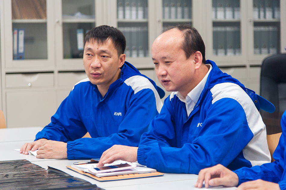 ▲聚酯薄膜部经理李波(右一)与聚酯薄膜部二车间车间主任孙俊(左一)