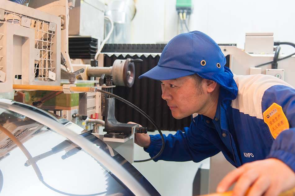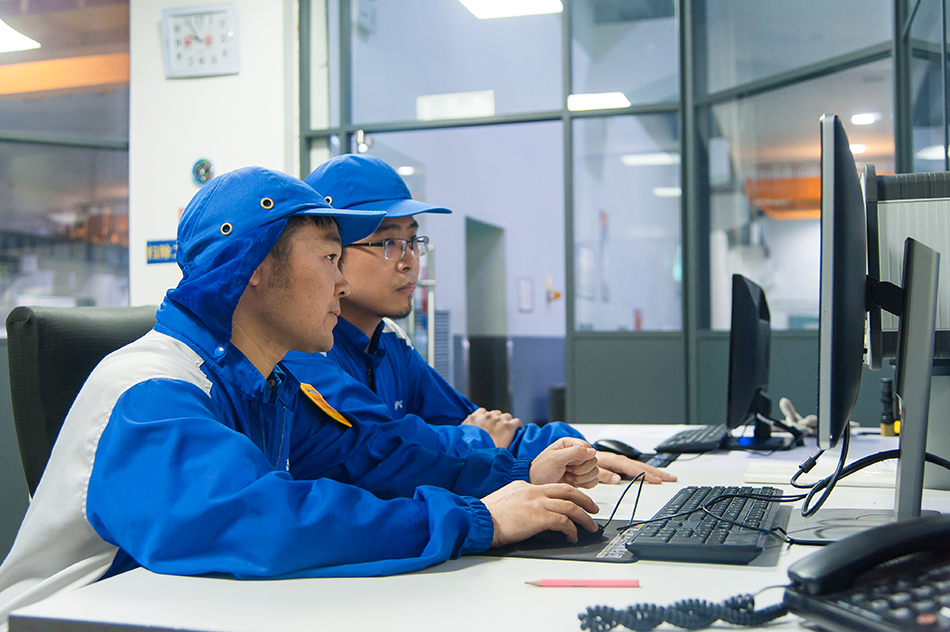 ▲聚酯薄膜部二车间工程师沈建忠调节模头静电吸附系统