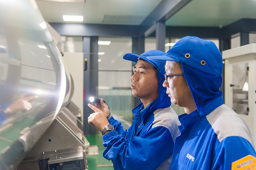 聚脂薄膜生产一车间主任臧其鹿(左)和聚脂薄膜部工程师姜伟涛(右)检查膜面